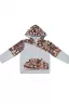 Костюм выполнен из футера двунитки. Комплект из брюк и худи на молнии с капюшоном. Яркие принты на плечах и в центральной части худи. Брюки выполнены в однотонном исполнении со стандартной линией талии.