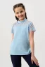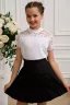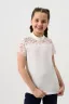 Блузка для девочек младшего и старшего школьного возраста, из трикотажного однотонного полотна – кулирка с лайкрой и эластичного кружева (дизайн и ширина кружева может меняться). Блузка полуприлегающего силуэта, с втачным коротким рукавом, с воротником – стойкой. Спереди отрезная кружевная кокетка. На спинке отсутствуют линии членения. Рукав одношовный, выполнен из эластичного кружева. Низ изделия подогнут.