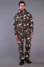 Комплект из куртки и брюк: ➠ Куртка с супатной бортовой застежкой. Полочки с притачными кокетками, с накладными карманами с фигурными клапанами, застегивающимися на пуговицу. По низу куртки притачная кулиса, со шнуром. Капюшон притачной по горловине, с кулисой по лицевому вырезу, стягивающейся шнуром. По передним частям рукавов внизу кулиса. Манжеты притачные, стянутые эластичной тесьмой. ➠ Брюки с цельнокроеным поясом, застегивающимся на петлю и пуговицу. Передние половинки состоят из двух частей: верхней и средней. На верхних частях расположены верхние накладные карманы и нижние накладные карманы с фигурными клапанами на пуговицах. Нижние карманы с объемом с одной стороны и переходят на задние половинки. Задние половинки брюк состоят из двух частей: верхних и средних. Верхние части фигурной формы. На средних частях ниже уровня колена расположена кулиса, стянутая эластичной лентой.