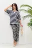 Костюм женский: туника и брюки. Туника прямого силуэта с округлой горловиной. Рукав цельнокроенный со швом, ниже локтя. На полочке два накладных кармана. Брюки полуприлегающие, с притачным поясом, изготовленном на многоигольной машине. На передней части брюк два внутренних кармана. В боковых швах внизу брюк маленькие разрезы. Костюм достаточно творческий за счет использования ткани в широкую полоску и цветочного принта.
