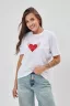 Женская футболка приталенного кроя из кулирки, идеально подчеркивает линии фигуры. Классический короткий рукав и круглый вырез делают её удобной и повседневной. Центральная деталь изделия — оригинальный принт на груди в виде красного сердца с крыльями, символично объединяя романтичность и воздушность. Такая футболка обязательно привлечёт внимание и станет любимой вещью вашего гардероба!