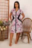 Женский халат средней длины, V-образный вырез горловины, по бокам фигурные вставки черного цвета, визуально корректирующие фигуру