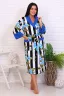 Оригинальный женский халат с красивым принтом на ткани в виде полос и роз. Застегивается на запах с поясом, длина ниже колена