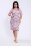 Этот халат представлен в длине миди с короткими рукавами и округлым вырезом горловины. Халат выполнен из ткани с принтом в виде крупных цветов на полосатом фоне. Центральная часть халата украшена вертикальной молнией, которая идет от горловины до нижнего края, позволяя удобно надевать и снимать изделие. Модель также имеет небольшие разрезы внизу для свободы движения. На передней части расположены удобные накладные карманы, выполненные из той же ткани, что и сам халат. Цветовая гамма сочетает оттенки серого и белого, что делает халат стильным и практичным для повседневного ношения.