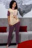 Домашний костюм с кофейным принтом. Футболка слегка приталенного силуэта со спущенной проймой. Рукава и брюки с цельнокроеными манжетами. Горловина обработана бейкой. Брюки не свободного кроя, заужены к низу. Пояс обработан эластичной широкой резинкой 3 см. В боковых швах карманы. Благодаря наличию в составе ткани полиэстера, колени на брюках не вытягиваются. Оттенок бордо может отличаться