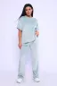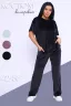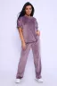 Костюм женский велюровый, повседневный, всесезонный. Костюм состоит из футболки и брюк. Футболка оверсайз прямого силуэта, длиной до бедра. Рукав втачной со спущенным плечом, длиной чуть выше локтя. Горловина с обтачкой, низ футболки с подгибкой. Брюки прямого силуэта, умеренного объема. На передних половинках брюк карманы с отрезным бочком. Пояс притачной с эластичной тесьмой. Низ брюк подгибка. Замеры объема талии брюк по нерастянутой резинке. Параметры модели 97-71-101. На модели представлен 48 размер.