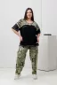 Костюм женский. Туника и брюки. Туника состоит из трех частей: цельнокроеная кокетка полочки и спинки из хлопковой сетки, средняя часть из набивной кулирки, нижняя часть туники выполнена из" дышащей "вискозы. На полочке накладные нагрудные карманы из сетки. Брюки "бананы". Передние и задние части брюк из трех частей. В верхней передней части брюк внутренние карманы. В средней части брюк по три вертикальные складки. Конструкция брюк позволяет скрыть любые недостатки в области бедер.