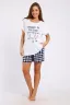 Костюм с шортами выполнен из трикотажного полотна кулирка. Костюм состоит из футболки и шорт. Футболка свободного силуэта, спущенное плечо, углубленная пройма, горловина окантована, на полочке выполнена печать. Шорты с притачным поясом на резинке, карманы в боковых швах.