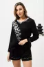 Костюм состоит из туники и шорт. Туника прямого силуэта, с V-образной горловиной, обработанной обтачкой из отделочного полотна. Рукав втачной, длинный, с манжетом. Шорты прямые, короткие, на манжете, на резинке.