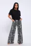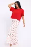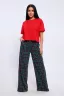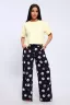 Домашняя женская пижама их мягкого хлопка. Свободная футболка прямого кроя, со смещенными плечевыми швами. Вырез горловины округлой формы с обтачкой. Длина футболки укорочена выше линии бедер, что является трендом сезона. Широкие брюки прямого кроя с высокой посадкой, с вместительными боковыми карманами, пояс на резинке с декоративной отстрочкой и атласным милым бантиком. Длина брюк стандартна, чуть ниже щиколотки. На модели представлен 48 размер. Параметры модели 165см, 97-71-101 В замерах готового изделия "Объем бедер, см" представлен замер "Обхват низа, см".