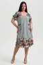 Платье женское полуприлегающего силуэта, слегка расширенное к низу. Кокетка полочки переходит в короткий цельнокроенный рукав, по шву притачивания кокетки к полочке кокетка присборена. Нижняя часть платья из отделочной ткани, сбоку разрезы. На полочке с каждой стороны по два накладных кармана, наложенных и смещенных друг относительно друга из основной ткани и ткани - компаньона. Все карманы функциональны. Свободный покрой и сочетание полосы с отделочной тканью придают платью достаточную комфортность и актуальность.
