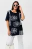 Туника женская полуприлегающего силуэта. Горловина округлая. Рукав цельнокроеный, короткий. На полочке два накладных кармана, в боковых швах разрезы. Принт на полочке и спинке.